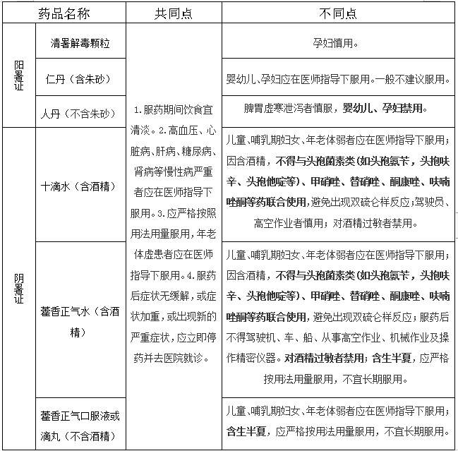 中醫(yī)辯證將中暑分為陽暑、陰暑、暑厥、暑風。以陽暑、陰暑較為常見。陽暑主要是因為在盛暑烈日時長途旅行、田野務農(nóng)、高溫作業(yè)等,導致熱毒傷陰,主要表現(xiàn)為發(fā)熱汗多、頭痛、煩躁、大渴等。治療陽暑可選清暑解毒顆粒、人丹、仁丹等。而陰暑是因夏季氣候炎熱而吹風納涼,或飲冷無度,中氣內(nèi)虛,以致暑熱與風寒之邪乘虛侵襲導致。是由于靜而得之,故名“陰暑”。主要表現(xiàn)為發(fā)熱頭痛、肢體拘急酸疼、無汗惡寒等。陰暑可選用十滴水、藿香正氣水(滴丸、口服液)等治療。其用藥主要注意事項歸納如下: